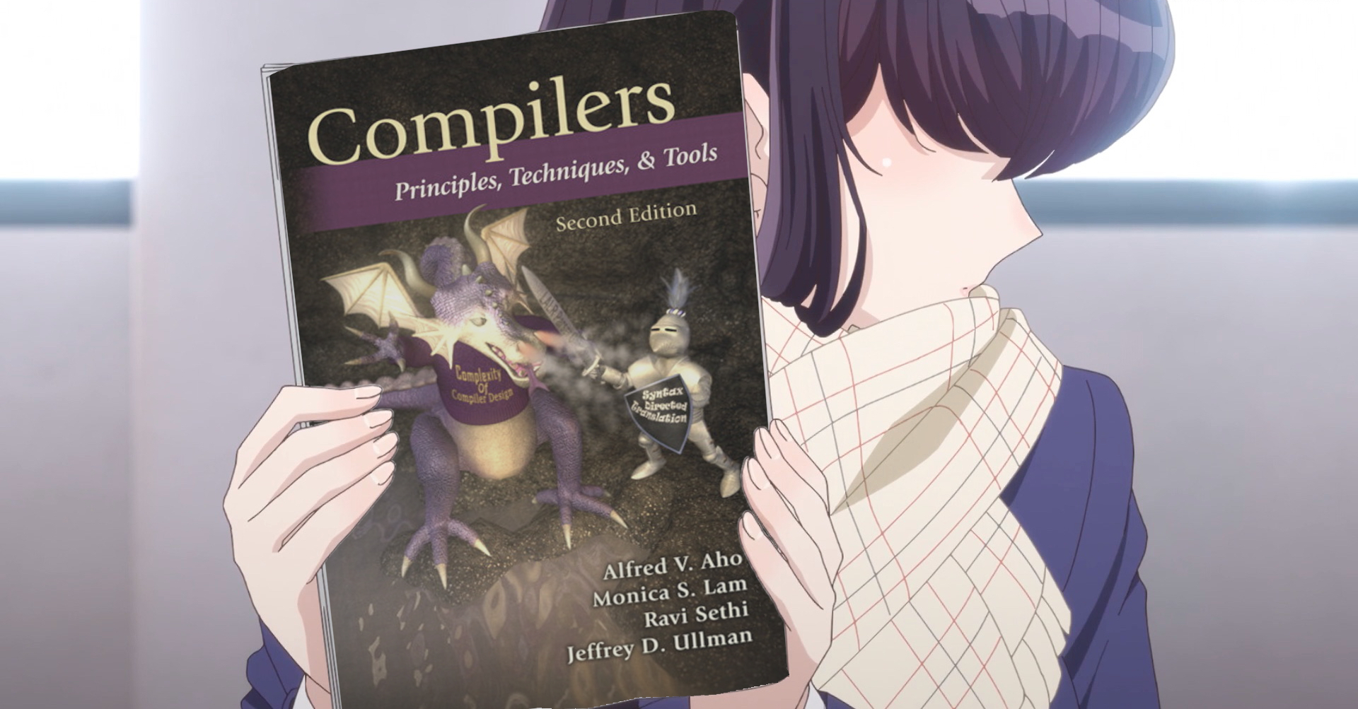 Komi-San holding the Compilers Purple Dragon book